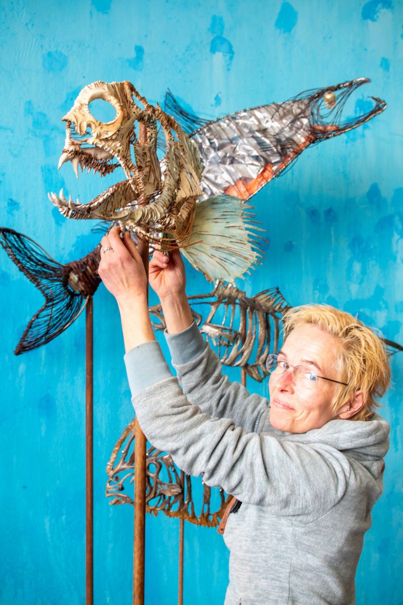 Als freischaffende Künstlerin lebe ich seit 1996 in Dortmund. Plastische Arbeiten entstehen aus Spachtelzement und Modelliermassen, aus Ton und Gips sowie in Bronze‑ und Aluminiumguss. Daneben betreibe ich plakative Malerei auf Wänden und allem, was sich zur Gestaltung anbietet. Experimentierfelder sind aktuell Linoldruck und Bildcollage, Scherenschnitt mit Folien und Fotokarton sowie Installationen und Figuren aus Alltagsresten. Gruppenausstellungen mit Künstlerkolleg*innen unterschiedlichster Sparten und Inszenierungen zu speziellen Themen lassen mich immer wieder neue Ansätze und Sichtweisen in der eigenen Arbeit finden