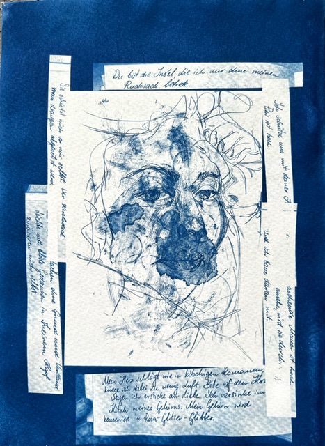 Cyanotypie – eine der ältesten fotografischen Techniken – interpretiere ich zeitgenössisch und nutze sie als sensiblen Bildraum. Zeichnungen und kalligrafische Elemente aus meinen Tagebüchern sowie Cyanotypien intimer Gegenstände durchdringen den analogen Prozess. Diese Dinge fungieren als Träger persönlicher Erinnerung und erscheinen im charakteristischen Blau der Cyanotypie. Die Arbeiten sind keine Fotografien im klassischen Sinne, sondern hybride Bildkörper.