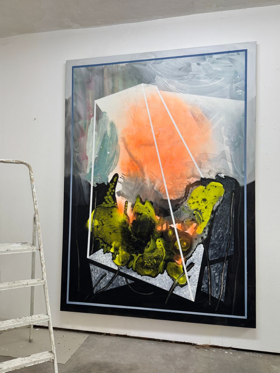 Abgeklebte Rahmen sowie raumdefinierende Linien, Balken oder Gerüste bilden tragende Elemente, durch die das zuvor vorherrschende Chaos – also Farbschüttungen und gestische Pinselstriche – in ein Gleichgewicht gebracht wird.